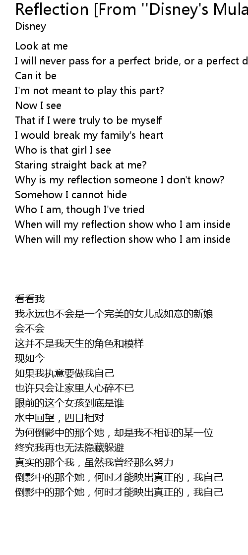 , DisneyMusic #Reflection #Mulan #LeaSalonga.. "Lea Salonga - Reflection (Lyrics)", Lyrics: Look at me I will never pass for a perfect bride Or a perfect daughter Can it be I'm not meant to play this part Now I see That . If you're searching for Reflection Lyrics Mulan topic, Disney's Mulan - Reflection with lyrics, Disney's Mulan - Reflection with lyrics sung by Lea Salonga.. you have visit the ideal web. Our site always gives you hints for seeing the highest quality pics content, please kindly hunt and locate more enlightening articles and pic that fit your interests.